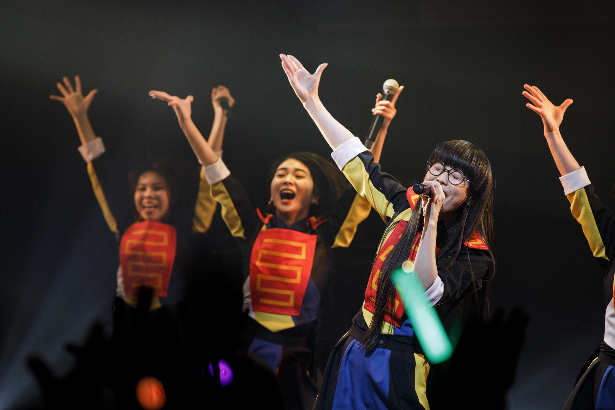 「GANG PARADE」「Happy Lucky Kirakira Lucky」「pretty pretty good」「FOUL」とギャンパレの代表曲を新旧織り交ぜて披露していく。昨日の再始動ライヴではフォーメーション移動中にぶつかったり、連携がうまくいっていなかったりしたが、わずか1日で10人がパフォーマンスを修正して仕上げてきたことが見て取れる。「FOUL」のドクソンを中心に9人が輪になって円を描くシーンでは、全員がマイクを通さず〈BODY & 10 SOUL〉と叫び、10人の連帯感と一体感を強く見せた。