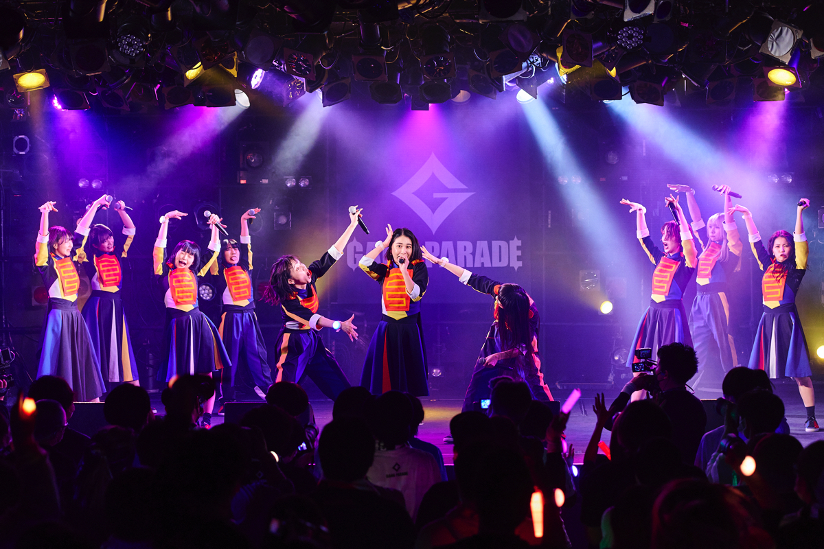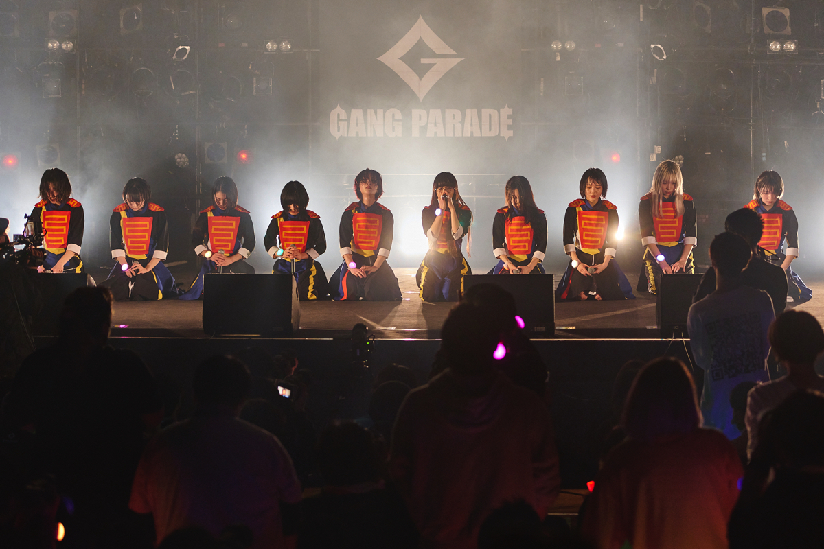 ヤママチミキを中心に「改めまして! 私たちエンジョイプレイ、みんなの遊び場、GANG PARADEです! よろしくおねがいします!」と挨拶をし、1人ずつ簡潔に自己紹介。そして「〈GANG PARADE GOES ON TOUR〉ファイナル、今日はよろしくおねがいします!」と次の曲「BREAKING THE ROAD」をタイトルコールすると会場がどよめいた。カミヤサキとBiSのアヤ・エイトプリンスがレンタルトレード中にリリースしたメロコア調のシングル曲だ。同曲で遊び人たちとともにサビで両手をあげ前後に振り盛り上がると、デジタルなトラックにナンセンスな歌詞が載る「イミナイウタ」へ。10人のフォーメーションで五輪を表現するなどギャンパレならではの世界観を見せつけた。続く「GANG PARADE」でも10人がステージ上を駆け巡り、大所帯の迫力を全開で活かした。一転、かわいらしいデジタルサウンドとメロディの「sugar」で会場をやわらかい雰囲気に包み、ギャンパレ楽曲の幅の広さをそれぞれ表現してみせた。