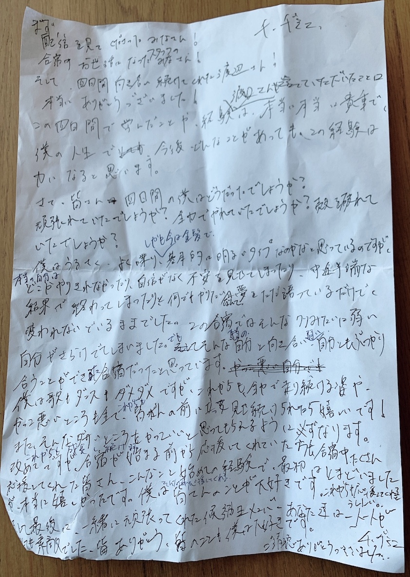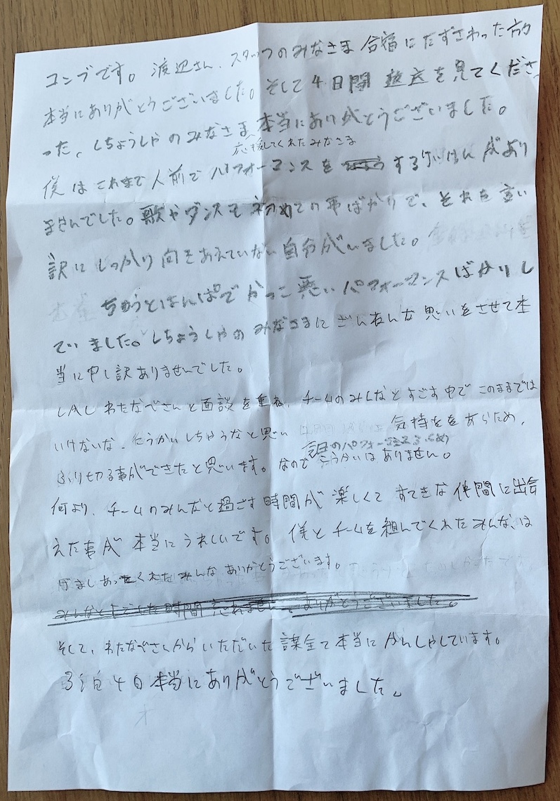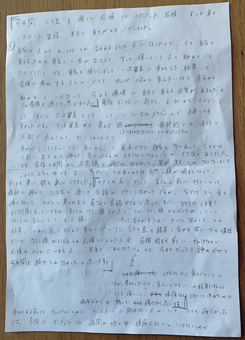 「そして考えたんですけど、自分たちも準備ができていないので、すぐにデビューできないなと。その状況の中で準備をしたいなと思います。そして、夏、もう一回合宿をします。もしよければ希望する方には全員次の合宿にも参加してもらいたいと思います。なので、まずはこの3人。彼らにも参加してもらいます」と渡辺は未来について語った。