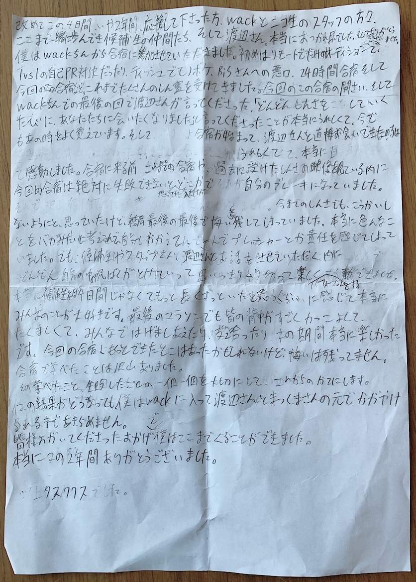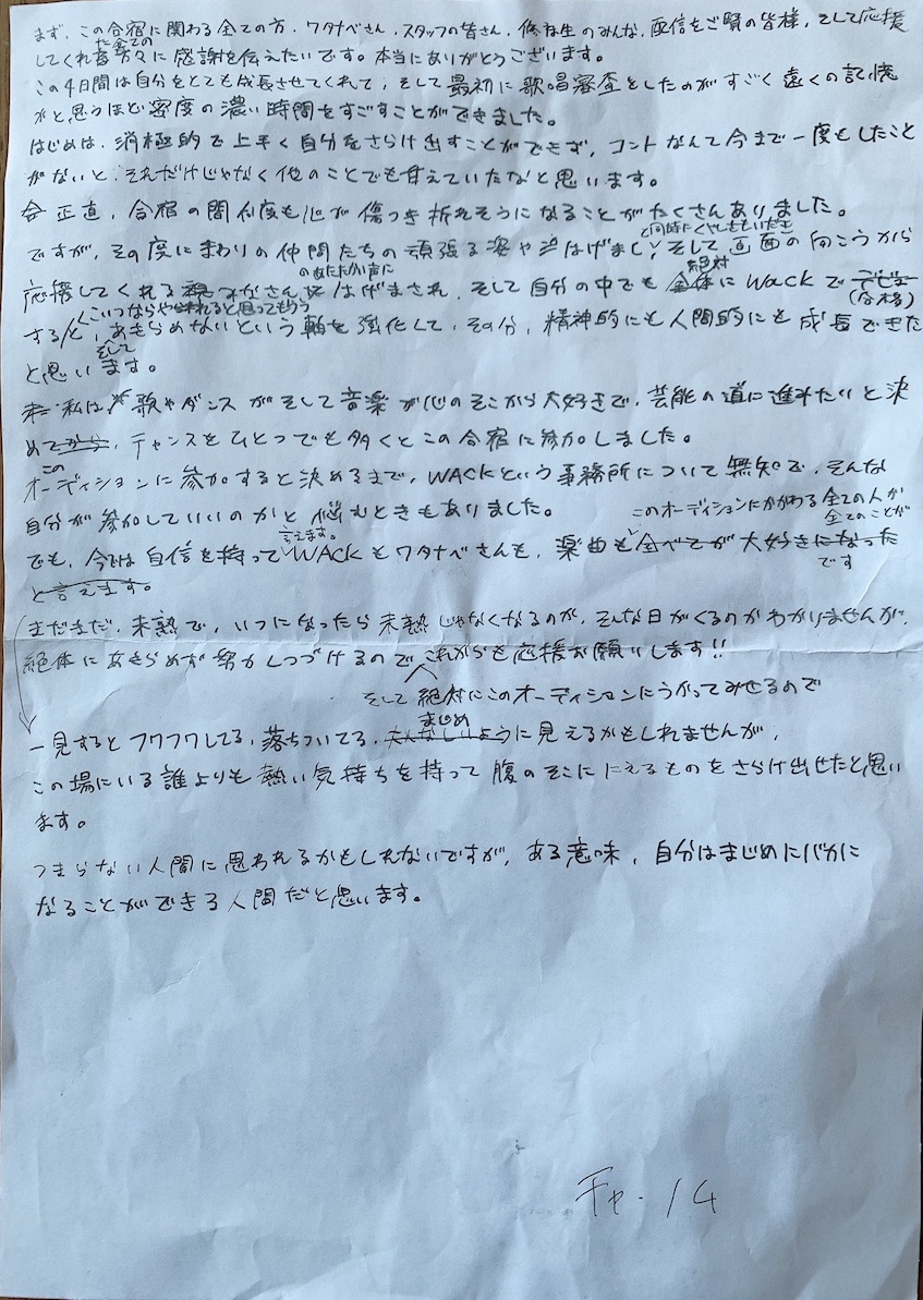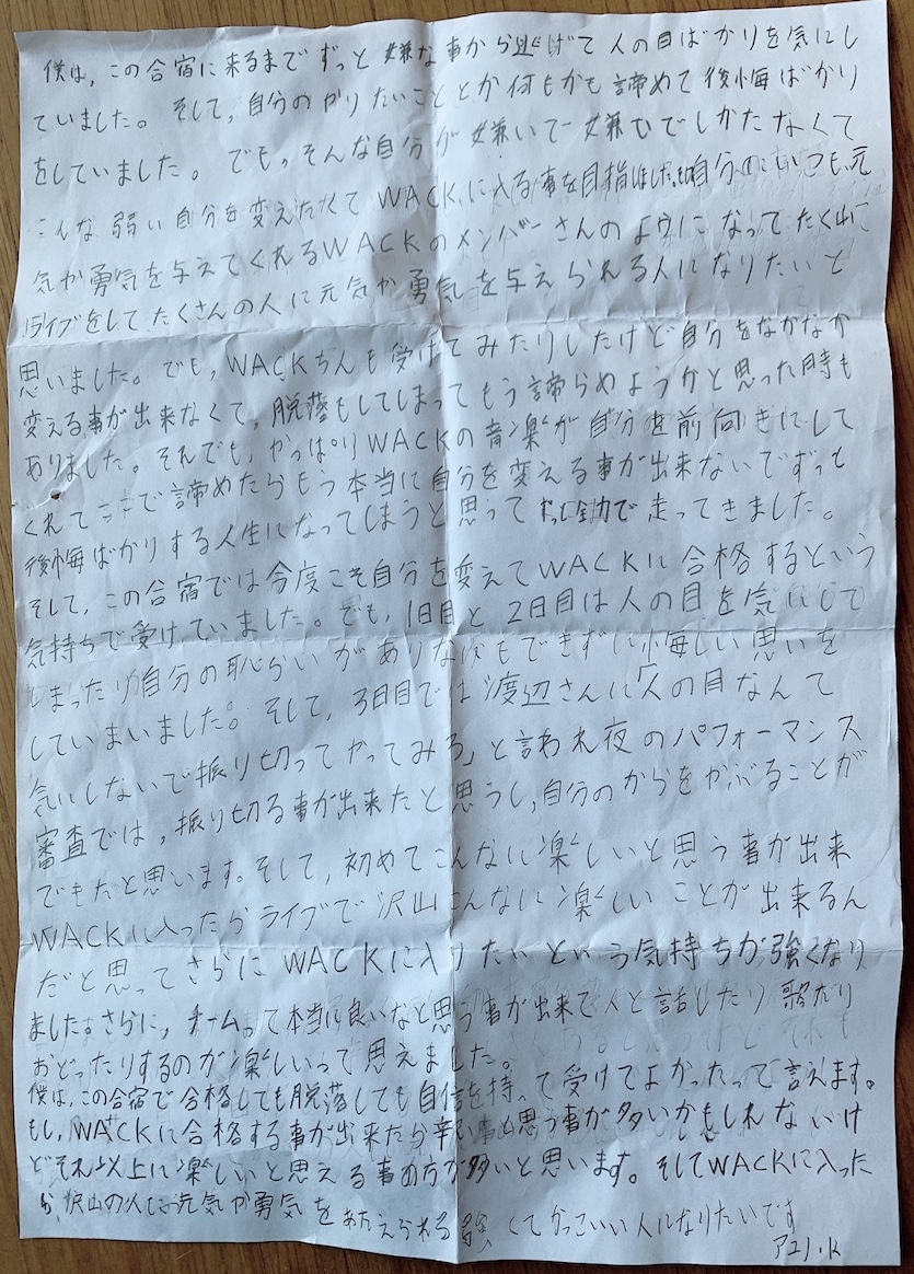 候補生16人が横一列になり、ポイントの少ない候補生から順にスピーチを行なっていった。涙を流して想いを伝えるもの、仲間への感謝を伝えるもの、どうしてもWACKにアイドルになりたいと気持ちを伝えるもの、それぞれの想いをまっすぐ伝えた。