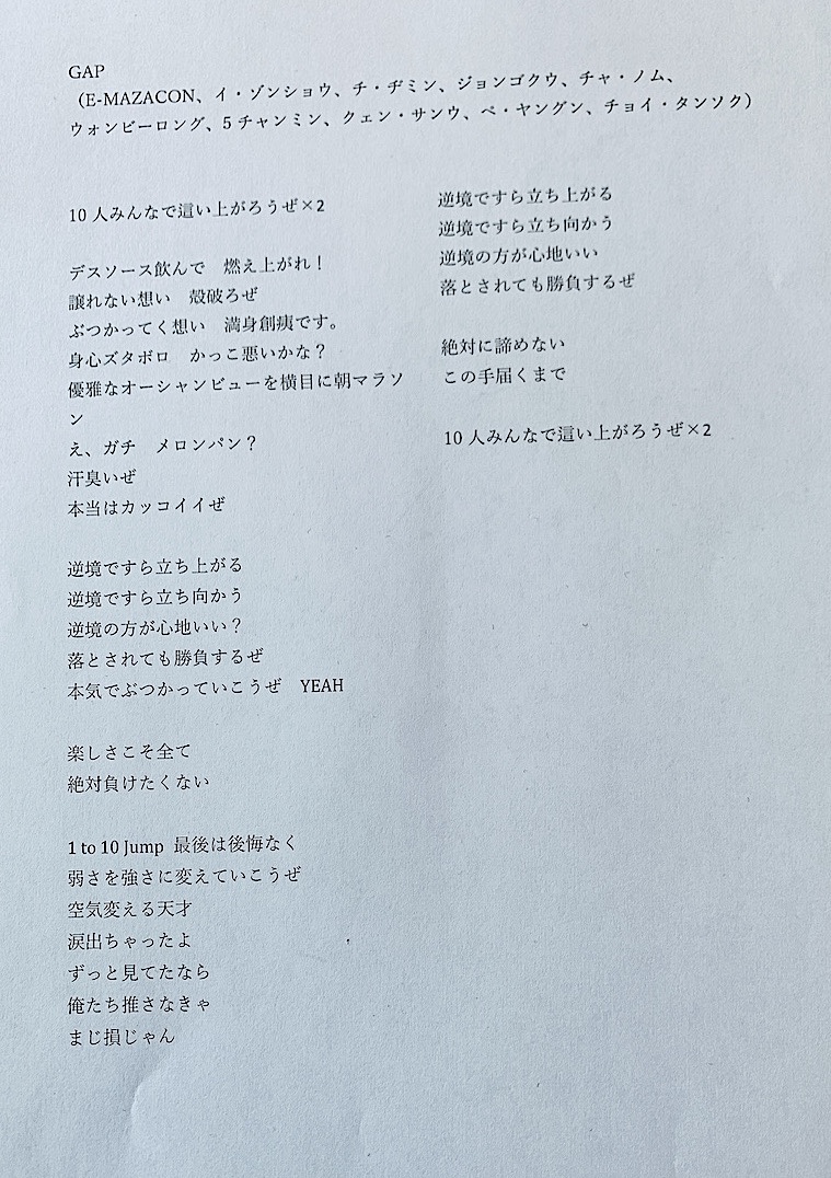 横一列になり、一人一人自己紹介をした後、「僕たち、白浜リベンジャーズです!」とチーム名を名乗った脱落組の10人。そして、「こんなのに合格できねーやついる? いねーよな! 絶対合格するぞー!」と東京リベンジャーズのマイキーをモチーフにした格好のチ・ヂミンが全員の気合いを入れ、「GAP(仮)」を披露。〈10人みんなで這い上がろうぜ〉という歌詞を10人でユニゾンし、全員にスポットが当たる振り付けで表現を行い、逆境をバネにして全員で這い上がるんだと気合いの入ったパフォーマンスを見せた。