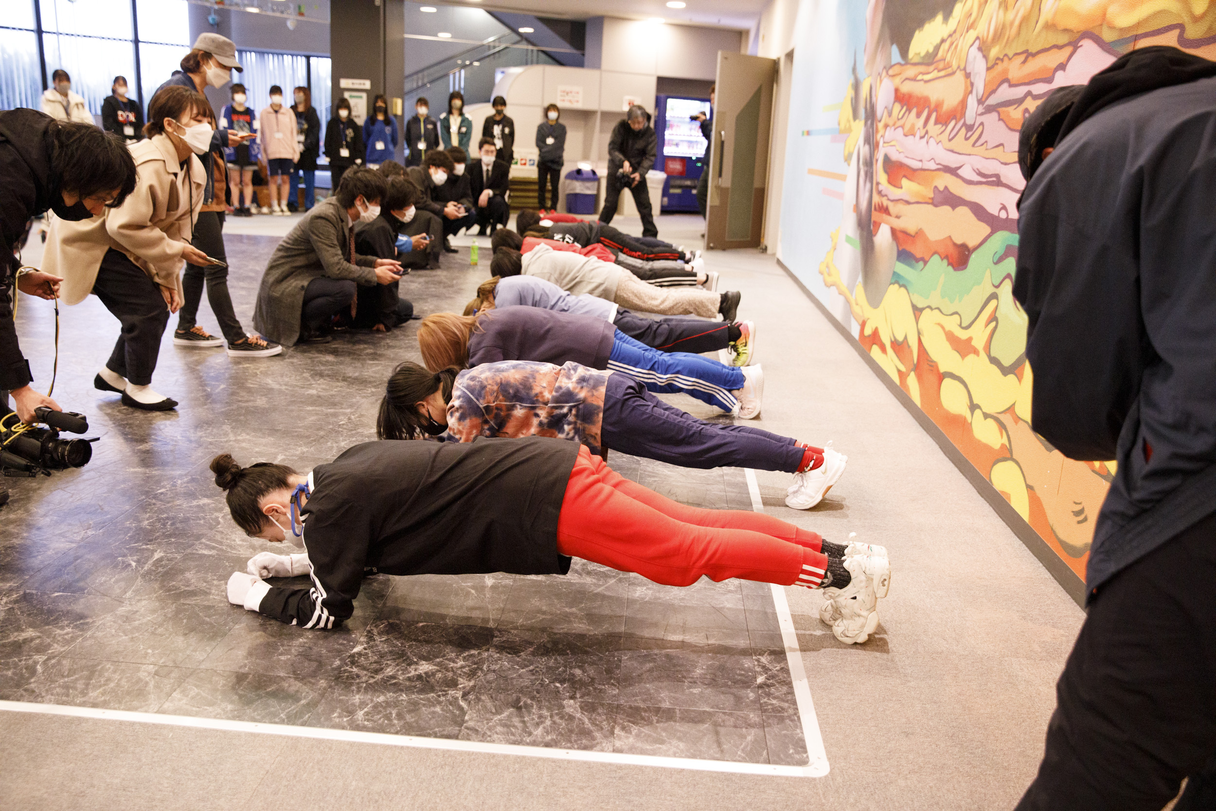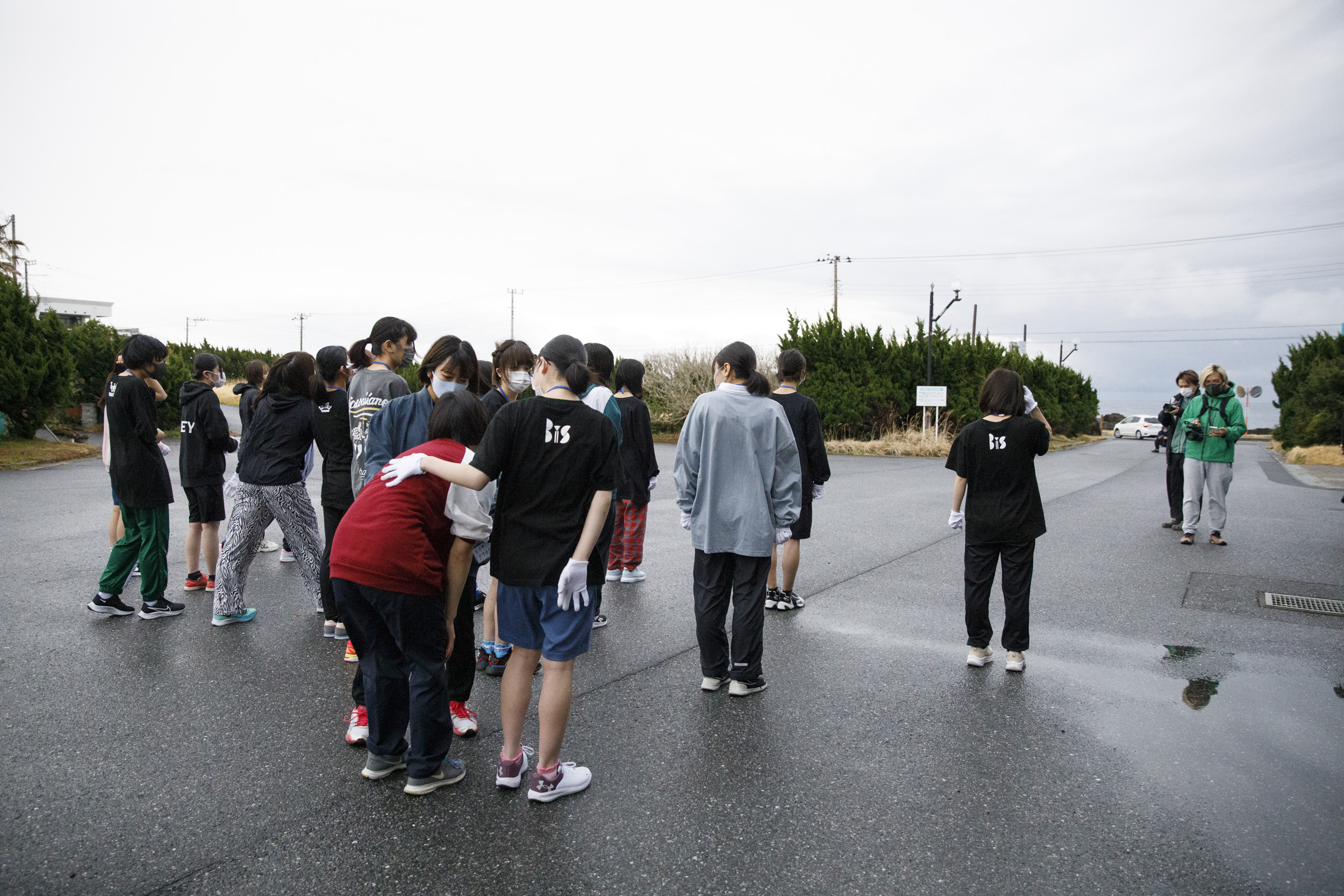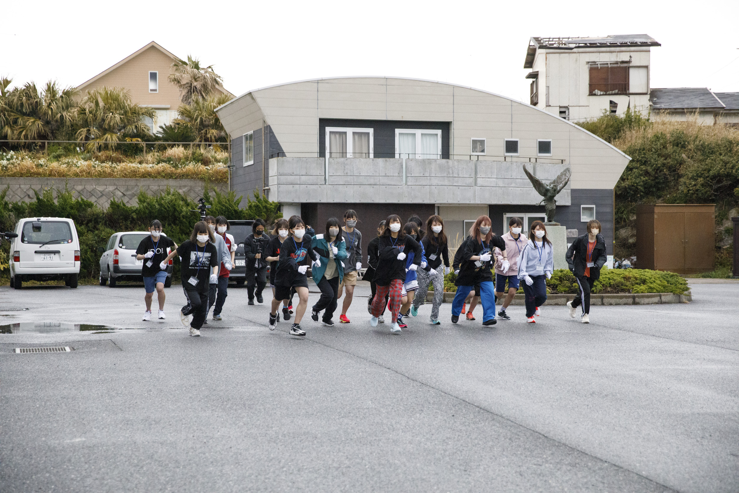 マラソン後、7時15分より朝食の時間に。その後、グループごとに体育館でパフォーマンス審査の練習に励んだ。