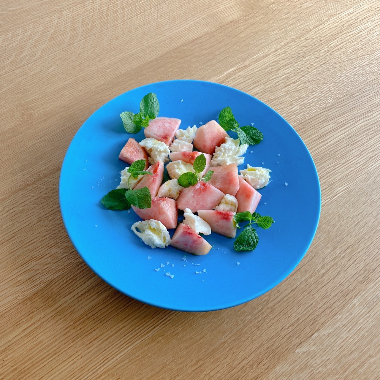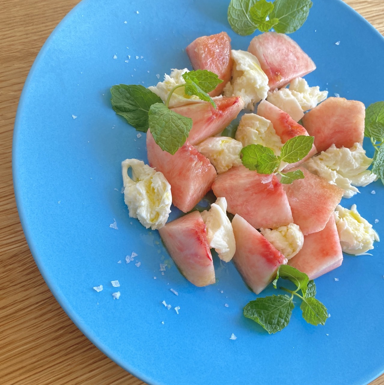 桃を好きな大きさに切ったら、モッツァレラチーズを適当な大きさに手でちぎり、お皿に盛る。そこにオリーブオイルをたらーんとかけ、お塩をパラッとしたら、もう出来上がり。