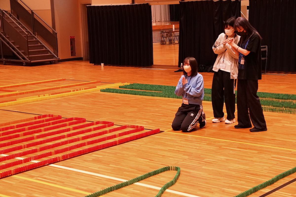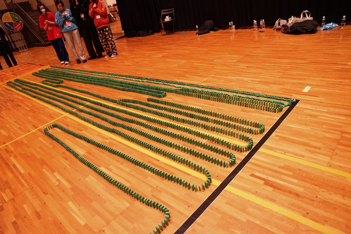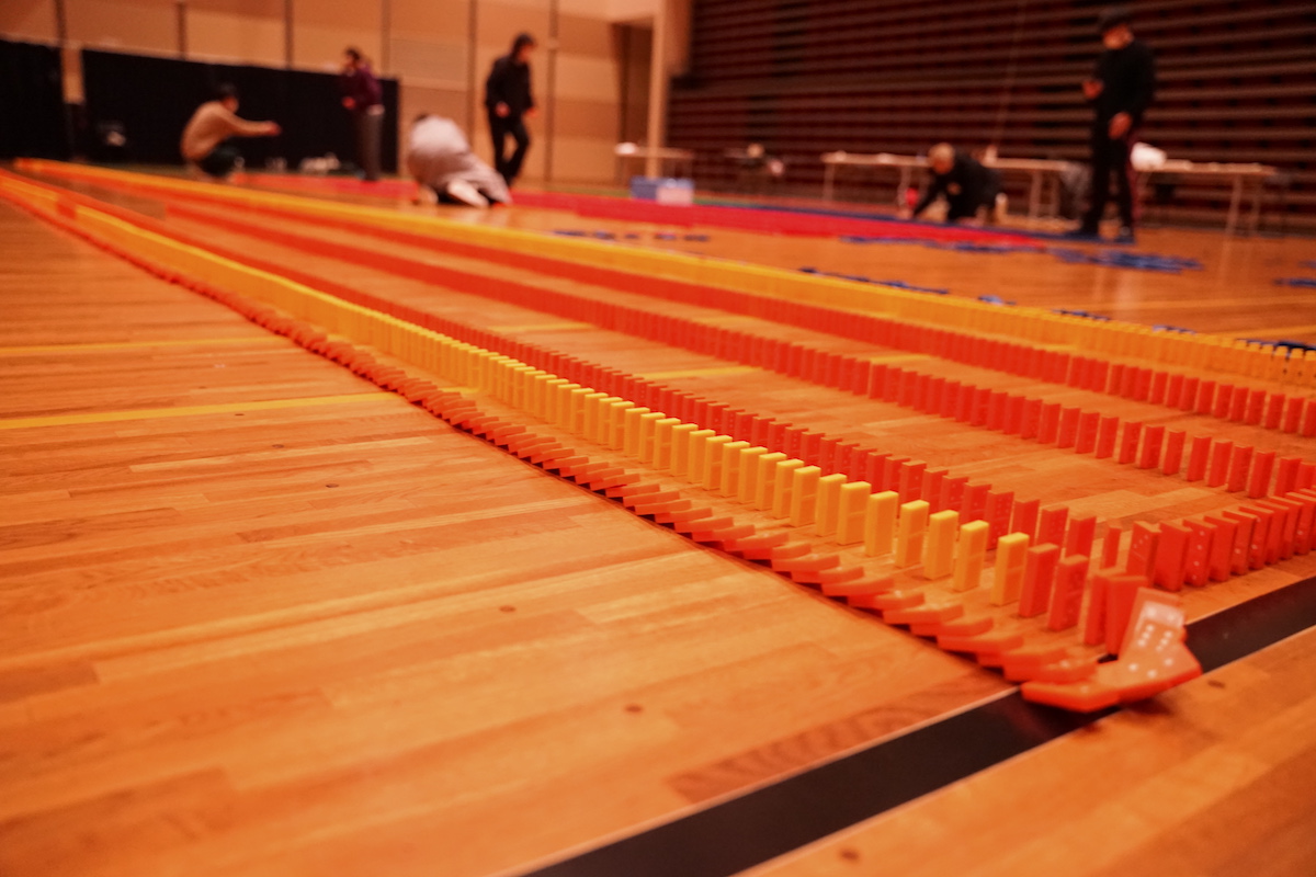 体育館を4ブロックに分け、約半日間にかけてコツコツと並び上げたドミノ。一番多くドミノを倒したチームからポイントをゲットすることができるということが発表されており、チームごとに無事に倒れていくか声をあげて見守っていった。