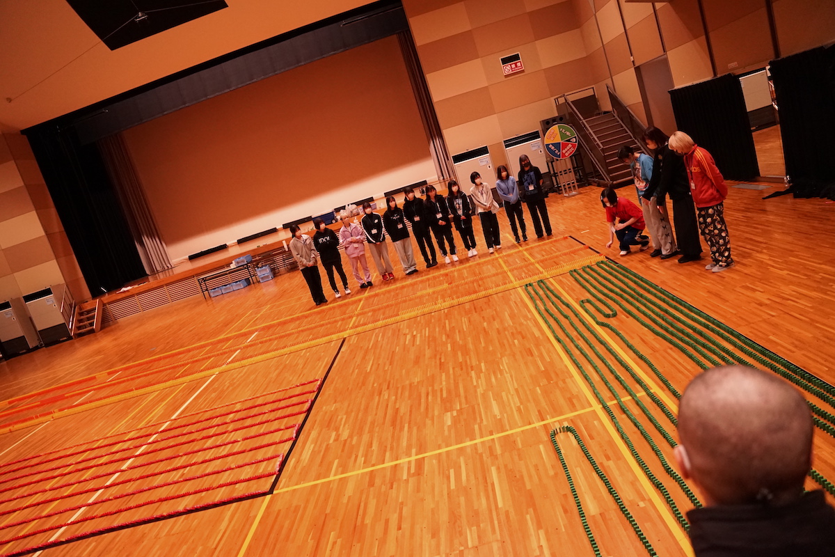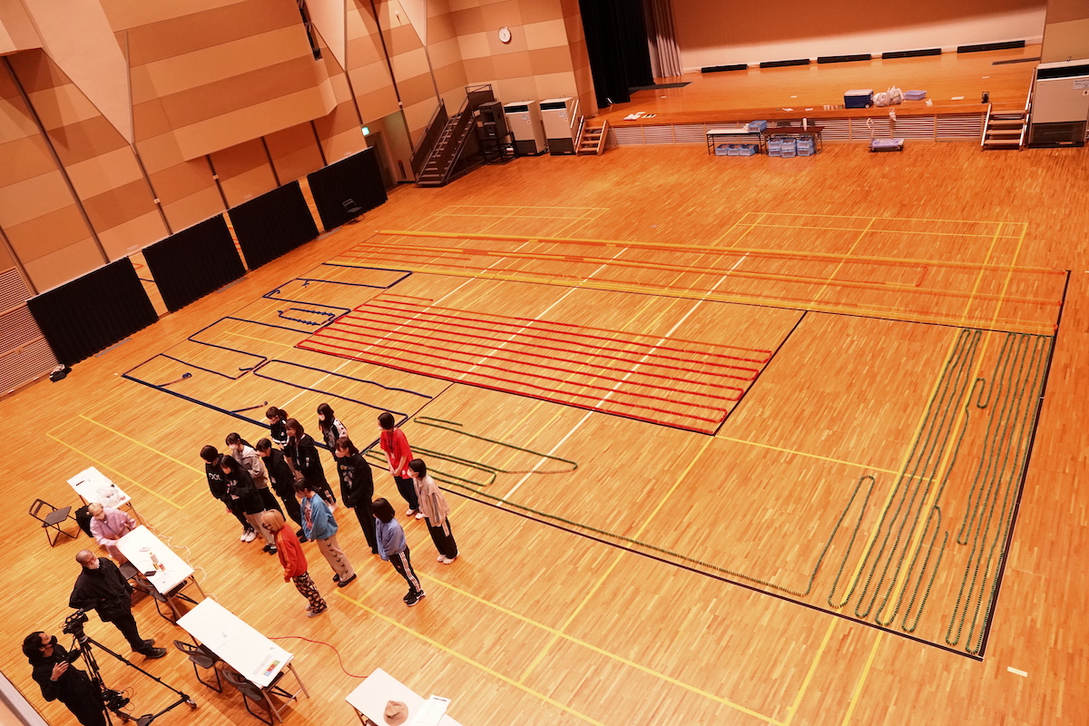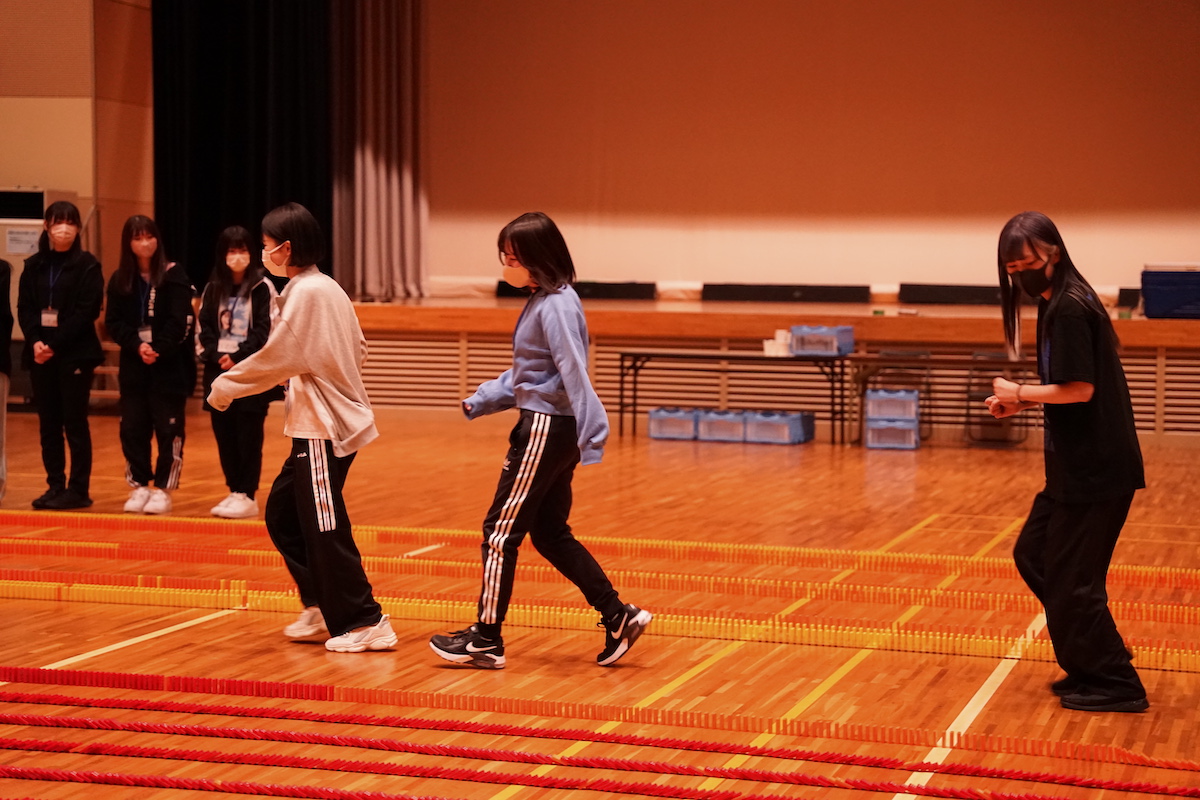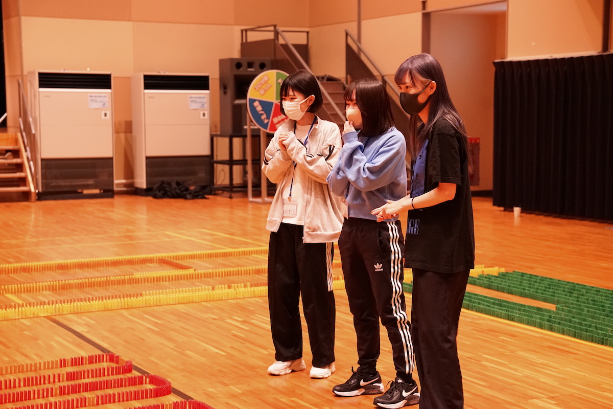 体育館を4ブロックに分け、約半日間にかけてコツコツと並び上げたドミノ。一番多くドミノを倒したチームからポイントをゲットすることができるということが発表されており、チームごとに無事に倒れていくか声をあげて見守っていった。