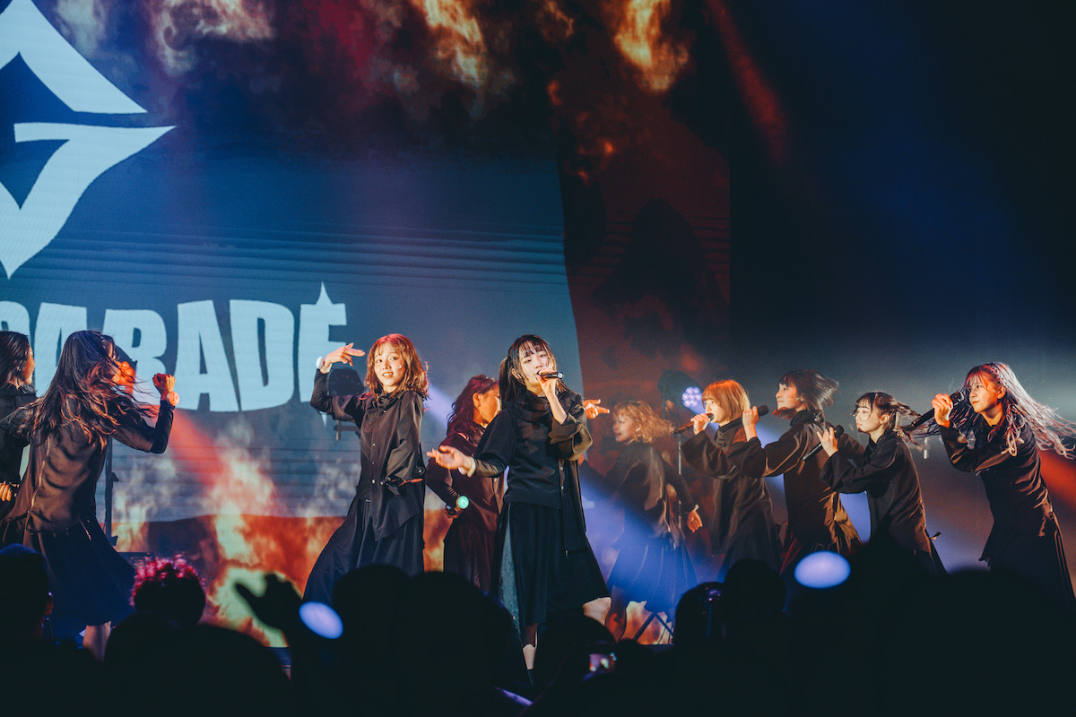 ミディアムバラードの「少し大人になって」でその歌声をじっくり聴かせると、キャ・ノン作詞曲のピアノとの絡みがイントネーションのロック楽曲「MELT」、そして新曲「INVOKE」を初披露。疾走感のあるロック曲ながらメンバーの2人ずつのユニゾンが際立つ楽曲だ。落ちサビにおけるテラシマとヤママチのソロパートもエモーショナルで、13人での振り付けとフォーメーションの一体感も相待ってGANG PARADE第二章を強く印象付けた。