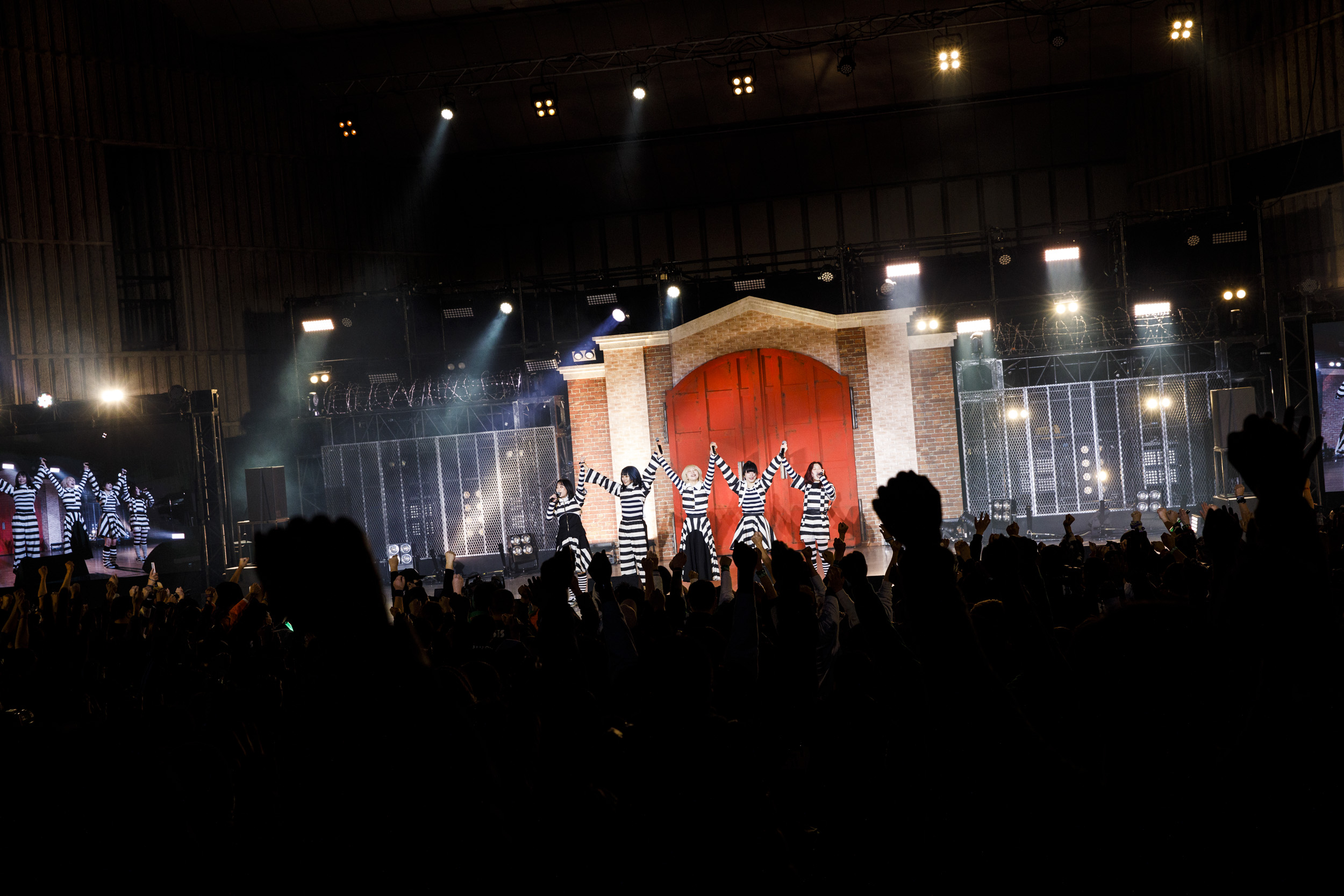 定刻の17時になると、「LET’S GO どうも」のイントロが流れ、中央の扉が開きスモークが立ち上がると、第1期BiSのアルバム『IDOL is DEAD』を想起させる”囚人服”的衣装をまとった5人――トギー、イトー・ムセンシティ部、ネオ・トゥリーズ、ナノ3、ヒューガーが勢いよく登場した。同楽曲を勢いよく歌うと、メロディックパンク調の「GOiNG ON」、3期BiSはじまりの楽曲「STUPiD」、スカパンク調の「DESTROY」、thee michelle gun elephantのカヴァー曲「スモーキン・ビリー」と5曲を立て続けにパフォーマンスした。