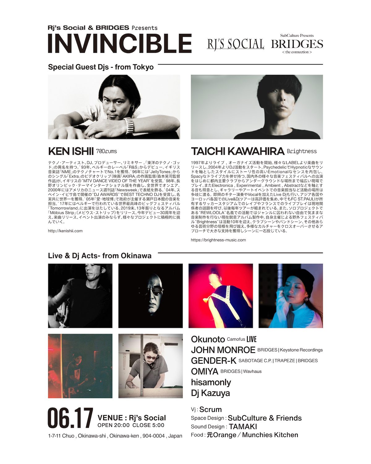 沖縄コザの音楽シーンを語る上で外せない重要な箱である“RJ’s Social”と同じくコザのシーンのキーパーティーとして日本各地からゲストを招き開催されている“BRIDGES”がタッグを組んだ新企画“INVINCIBLE”が始動。第1回目となる今回は今年DJ活動30周年を迎える“KEN ISHII” にBrightness 主催として活躍を続ける“TAICHI KAWAHIRA”をダブルヘッドライナーとして迎えての開催となる。迎え撃つのは沖縄のテクノシーンの顔役であるJOHN MONROE、GENDER Kを中心にコザの実力派がラインナップ。まだまだ大きな発展を続けている沖縄のシーンにおいて重要な役割を果たしていくことになるであろう本Partyの初回をお見逃しなく。