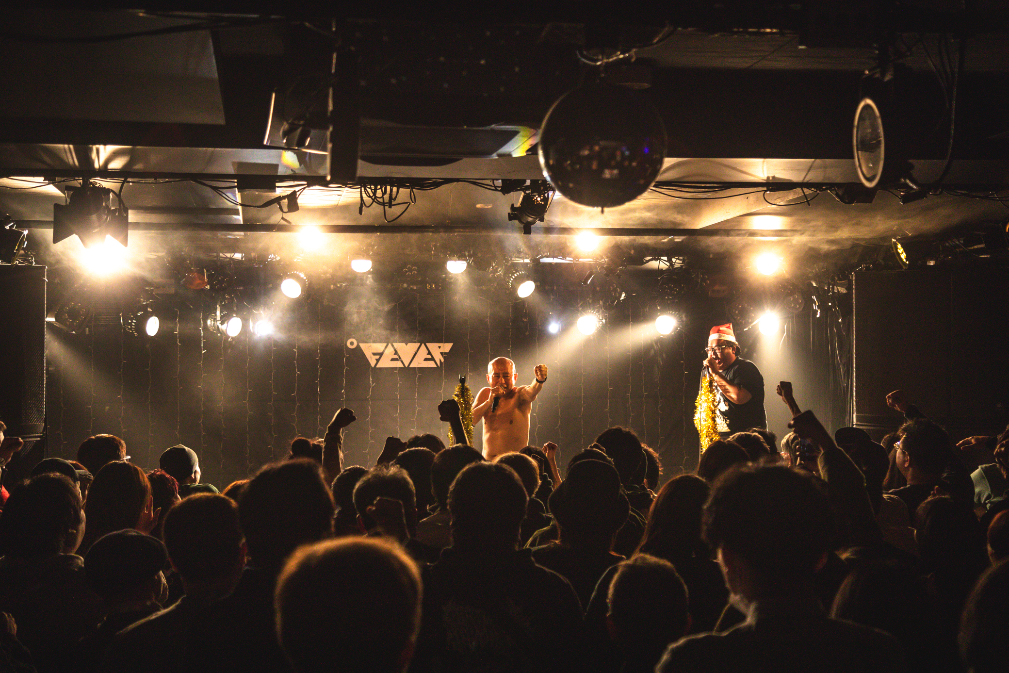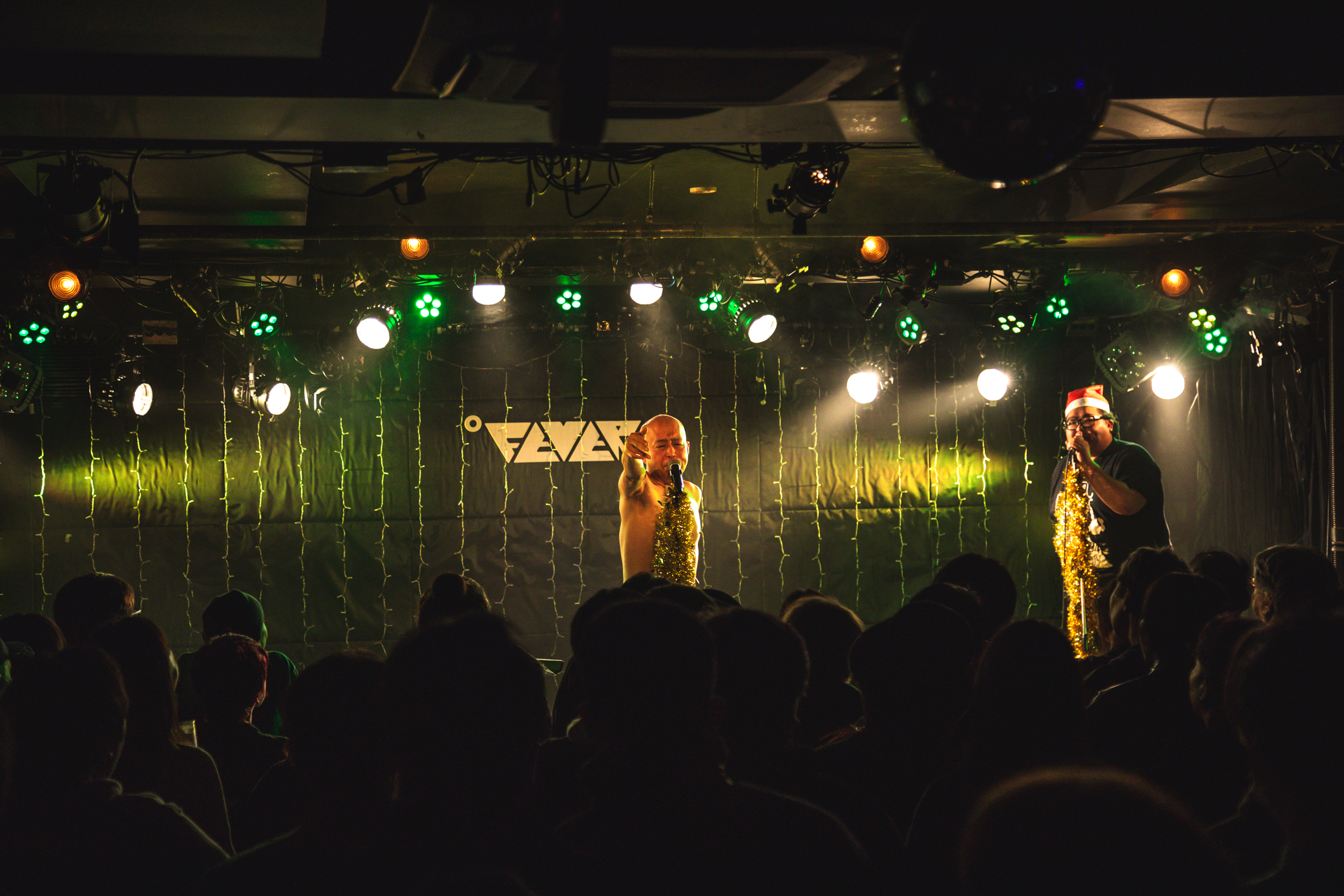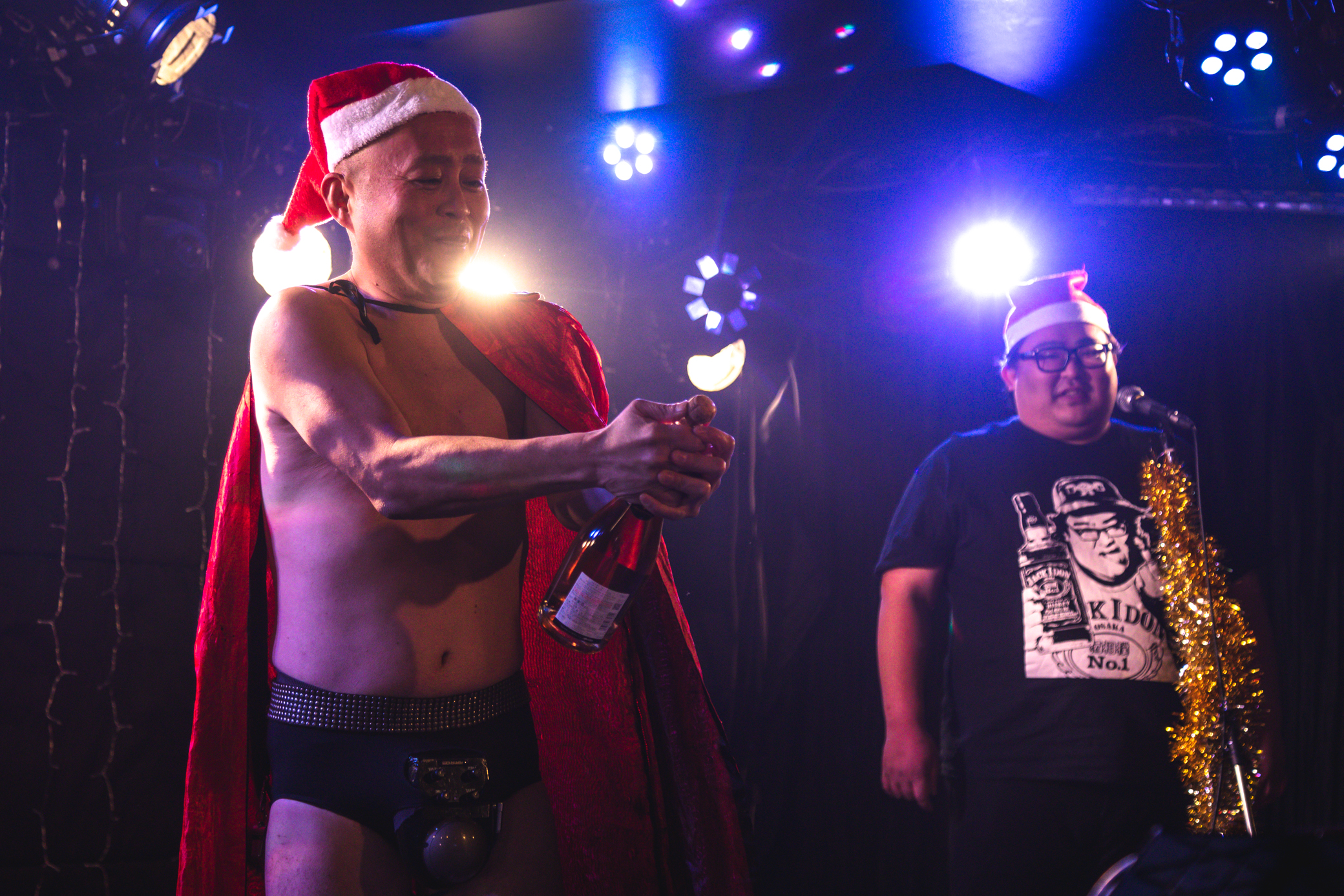 このまま終わらないのがクリトリック・リスのクリスマス。「ショーは終わっているので、ここから先は面倒なお客さんを相手にしましょう!」と酒相撲をし、アンコールで持ち曲を歌い、最後はオアシスの「Don’t Look Back in Anger」で大団円。例年は、酒を煽り、カラオケ大会が始まりめちゃくちゃになるが、パートナーのあいどんとともに、しっかりとライブの終わりのケジメをつけてステージを後にした。