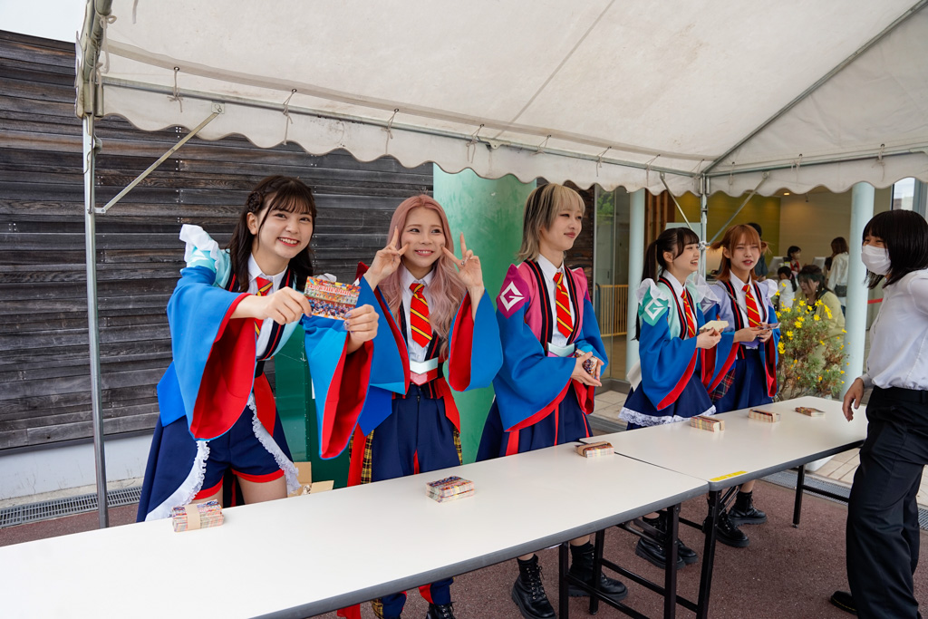11時からは、ノームショップで、ショップアクティビティが行われた。ノームショップは、ひらかたパークのオリジナルグッズ、お菓子、人気キャラクターグッズなどを販売している同園のメインショップ。11時〜11時45分まではユイ・ガ・ドクソンと月ノウサギが、11時45分〜12時30分まではテラシマユウカ、キラ・メイが、買い物をすると、その商品を手渡してくれた。ここでも、長蛇の列ができ大人気。ドクソンと月ノは、一緒に「はい、どーぞ」と声を合わせて商品を渡すなど独特のコンビネーションを見せた。遊び人たちは、カメラでメンバーの写真を撮ったり話をするなどして楽しんだ。