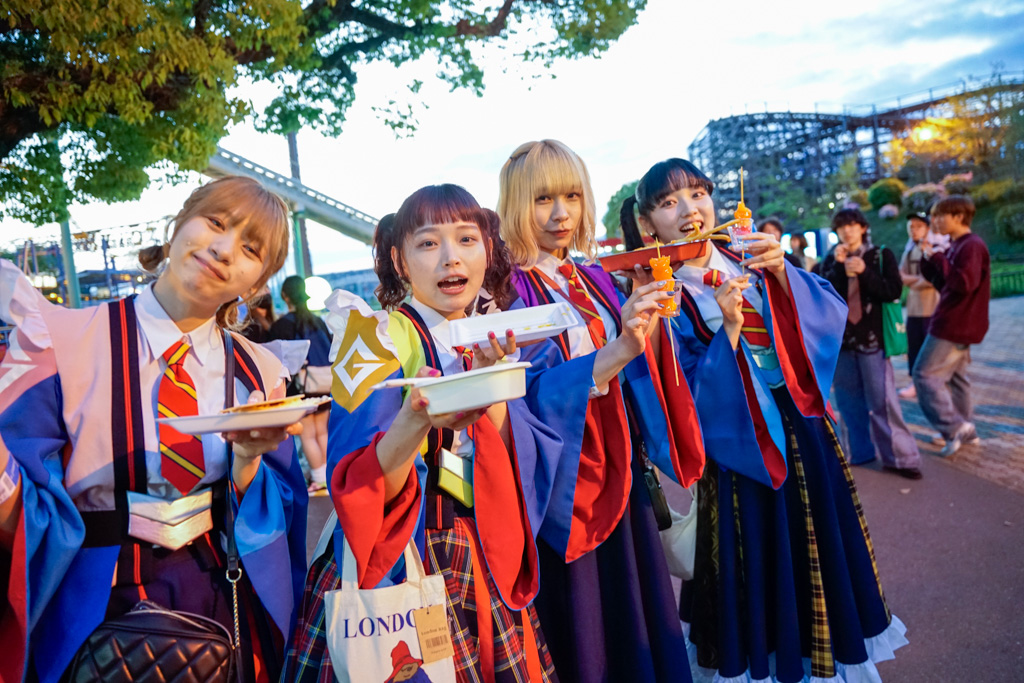 アクティビティ時は写真・動画撮影OKということで、遊び人たちはカメラを向けながらステッカーを受け取っていく。人数が多いので、話せる時間はほとんどないが、メンバーがフレンドリーかつ気さくにステッカーを手渡してくれる。ステッカーのお渡しを終えたメンバー5人は、園内のフードコートで思い思いのフードを購入したり、アトラクションに乗ったり、早速ひらパーを満喫。メンバーたちも2回目のひらパーということで、楽しみ方をわかっており、リラックスして園内を満喫している様子。