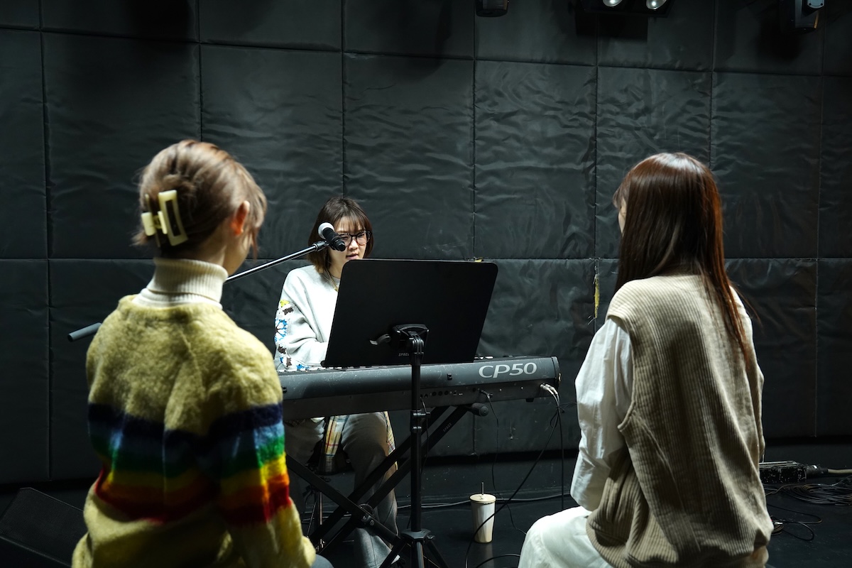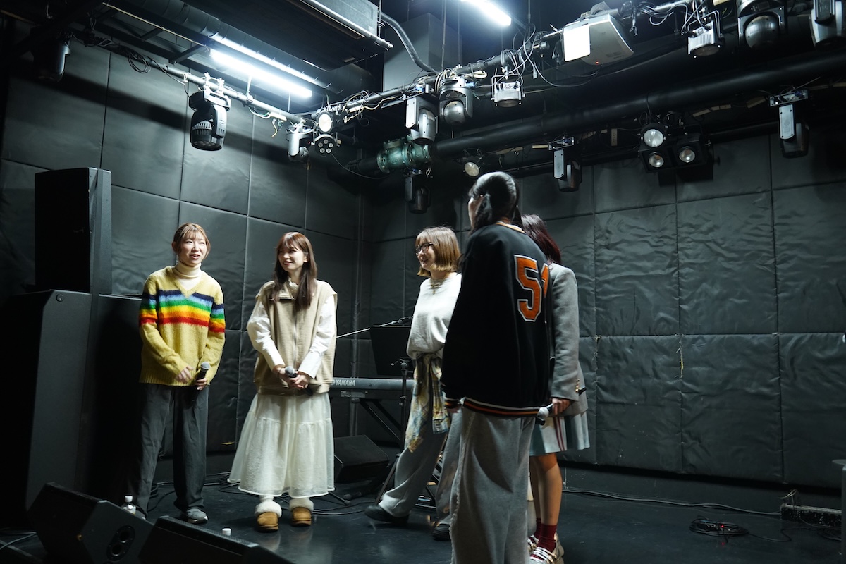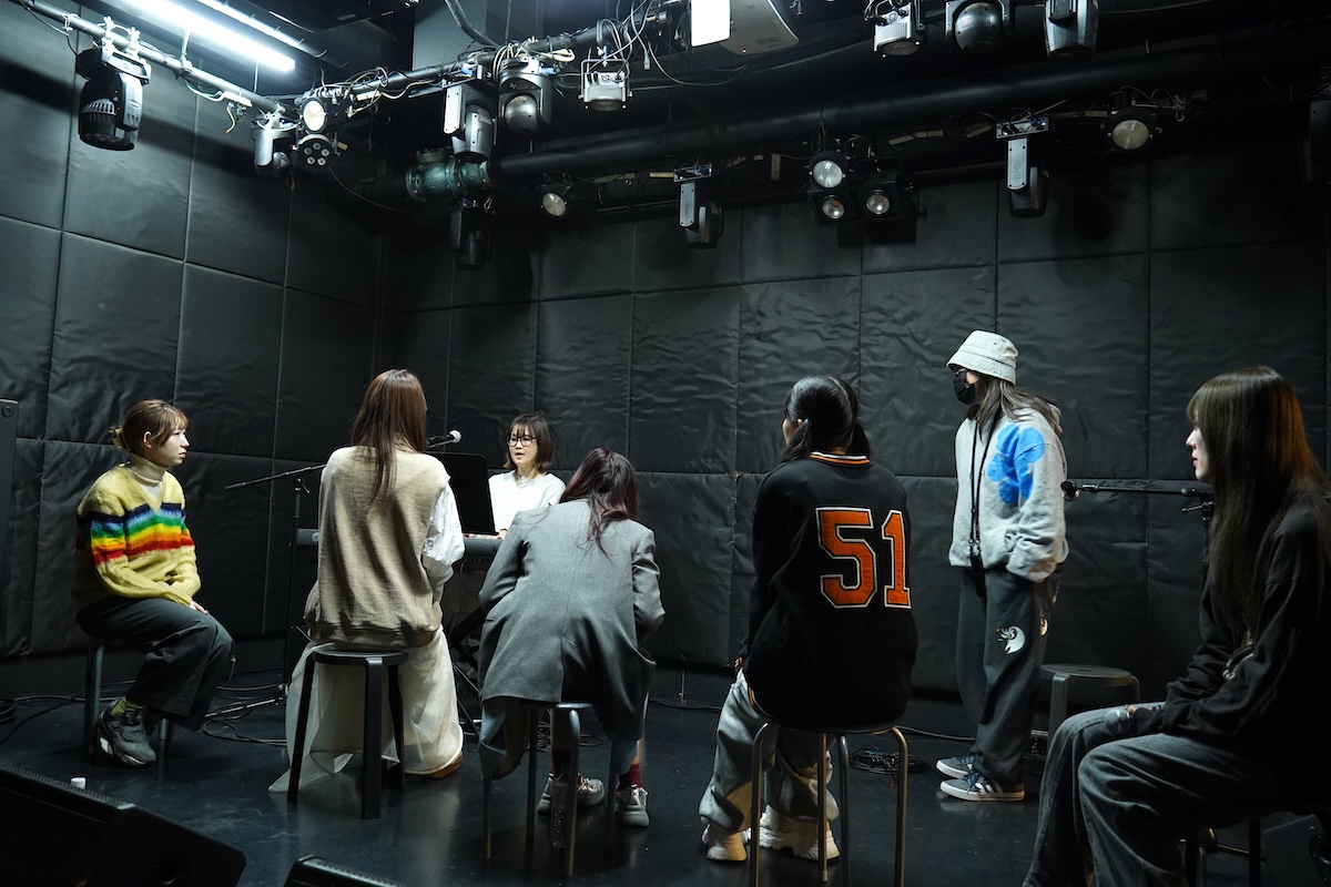 ワンマンのレポートを相談したところ、本番前日10時にとあるスタジオに来てほしいと返事があった。足を運ぶと、メンバー5人に加え、楽曲を手がけてきたBACK-ONのKENJI03、ボーカルトレーナーの酒井ゆかが揃い、アコースティックセットのリハーサルが行われていた。KENJI03のギター、酒井のキーボードに寄り添うように、5人はスタンドマイクの前で歌い上げる。コーラスやニュアンスを酒井が丁寧に確認していき、レオナは「walk」でのフェイクを何度もトライ。その真剣さの中に、家族のような距離感と信頼関係が垣間見える。3時間にわたる濃密なリハーサルは、翌日の公演への並々ならぬ覚悟を感じさせた。