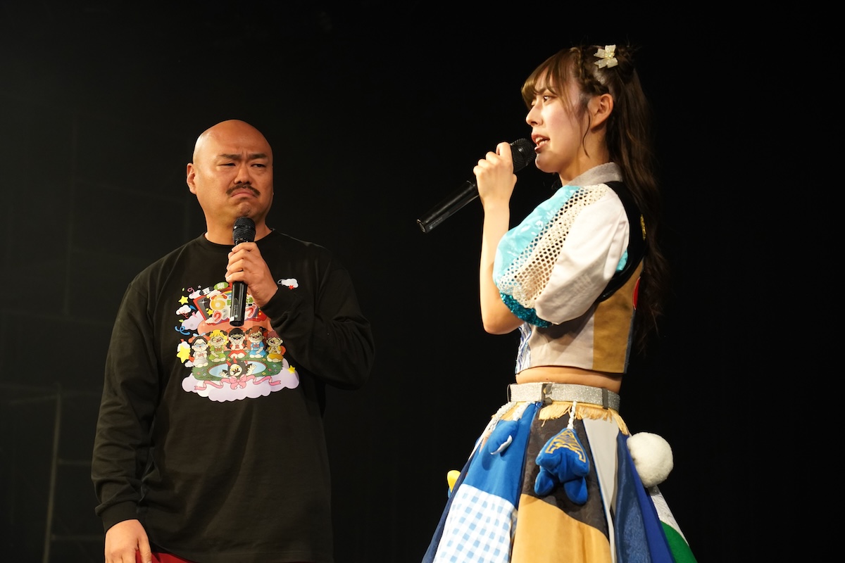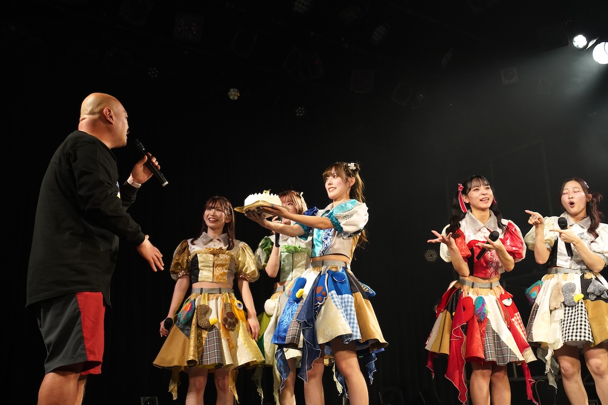 コントコーナーでは、この日49歳の誕生日を迎えたクロちゃんが登場。「告白」をテーマに、クロちゃんがレオナに何度も振られてはタイムリープする——というドタバタ劇が展開され、メンバーとの息の合った掛け合いに、バラエティ番組出身グループとして積み重ねてきた経験が垣間見える。コント終盤にはメンバーからサプライズでバースデーケーキが贈られ、会場は温かな笑いと祝福に包まれた。