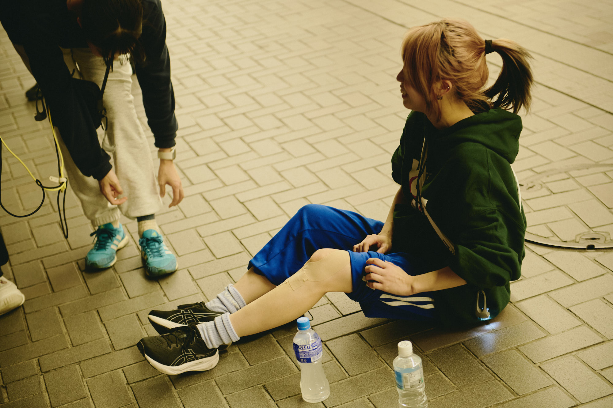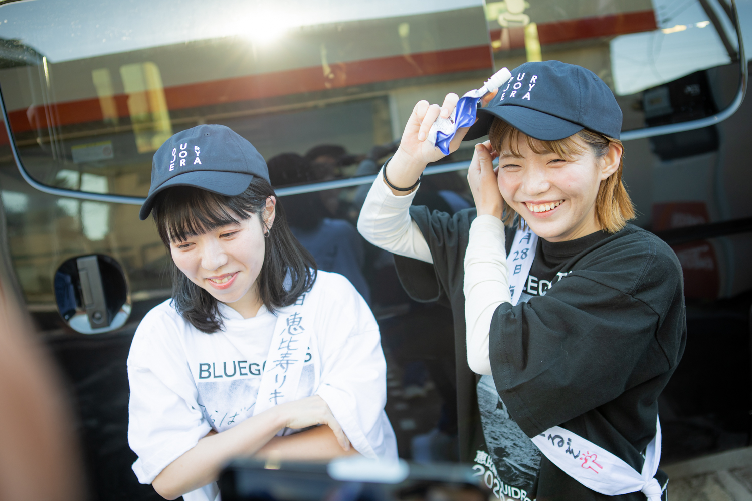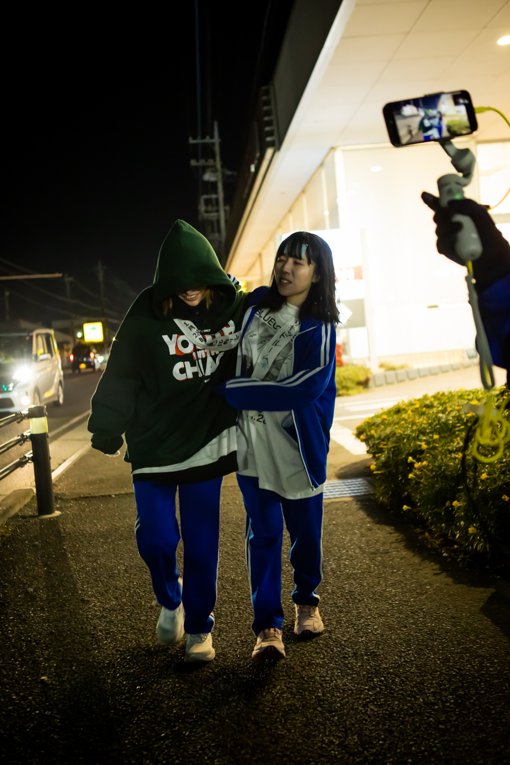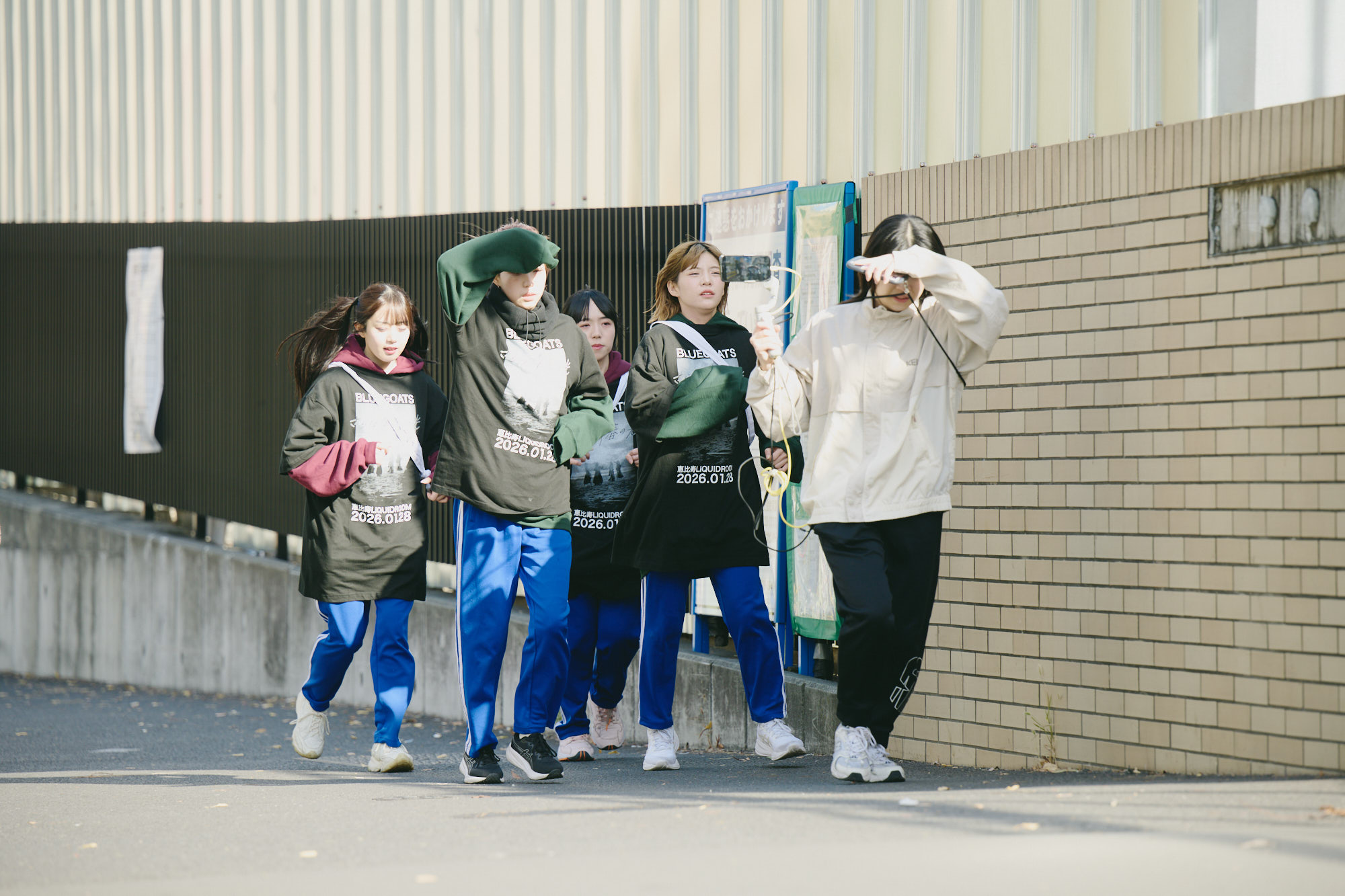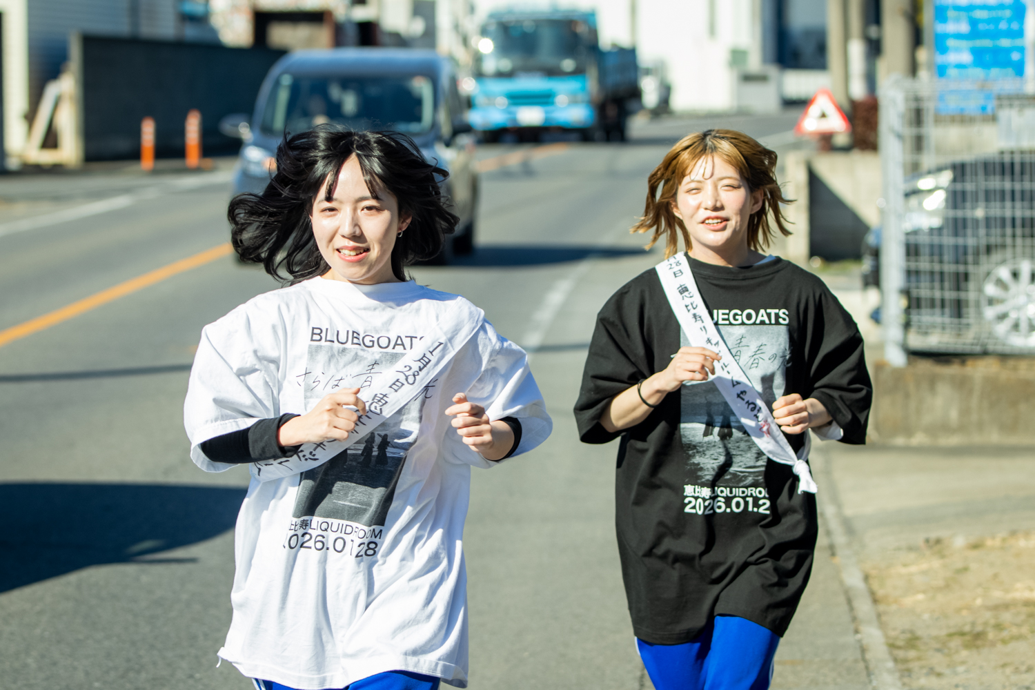 これまでBLUEGOATSはマラソン企画を3度行ってきているが、チャンチーとソンソナは今回が初めての挑戦となる。チャンチーはメンバーの中では身体が弱く、事前に不安もあったが、スタート直後は快調に走っている。日差しが強く、10km地点で、かいなとソンソナがキャップを手渡す。笑顔で順調そうだ。