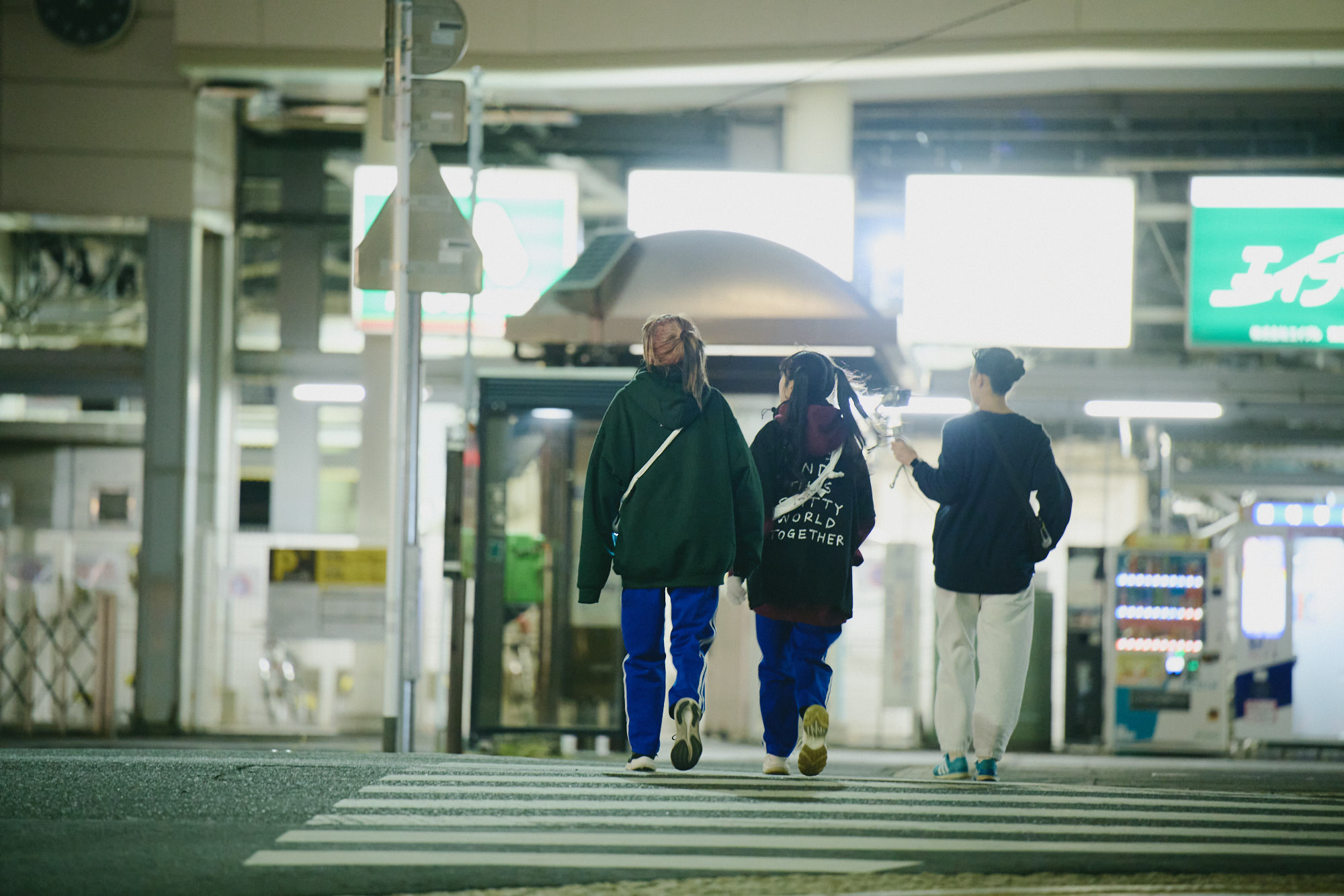 4時10分頃、ほんま・かいなとソンソナ、手を繋ぎながら東京に突入した。4時27分頃、約80km地点。35km近く走っているのにペースがまったく落ちず、明るく笑顔で走る2人。そんな2人を中継地点で迎え入れるマリンとチャンチー。4人一体で都心へ向かっていく。