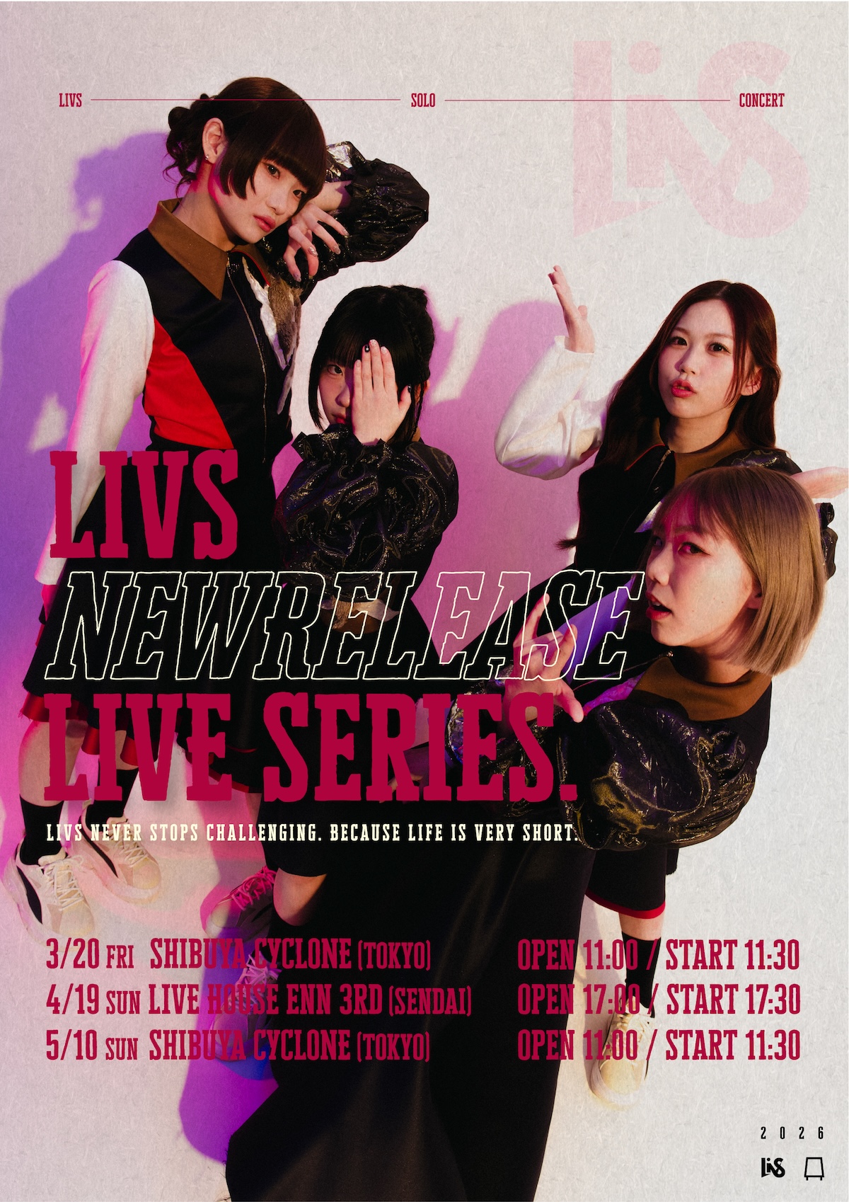 “Life is very short.”をコンセプトに活動する4人組ガールズグループLiVS。今作は、LiVSの楽曲としては初となる、タオルを振って全身で楽しめるライブでの解放感を強く意識した1曲に仕上がっており、“まだ終わっていない、その先へ”と突き進む意思もにじむ楽曲となっている。
